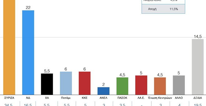 Προηγείται ο ΣΥΡΙΖΑ με 25% στην εκτίμηση πρόθεσης ψήφου και ακολουθεί η ΝΔ με 22%, βλέποντας τα ποσοστά της να ενισχύονται σημαντικά σε σχέση με τον Ιούνιο, οπότε και συγκέντρωνε 16,5%. Αντίθετα παρατηρείται σημαντική μείωση του ποσοστού του ΣΥΡΙΖΑ σε σχέση με το 34,5% που συγκέντρωνε το ίδιο διάστημα.